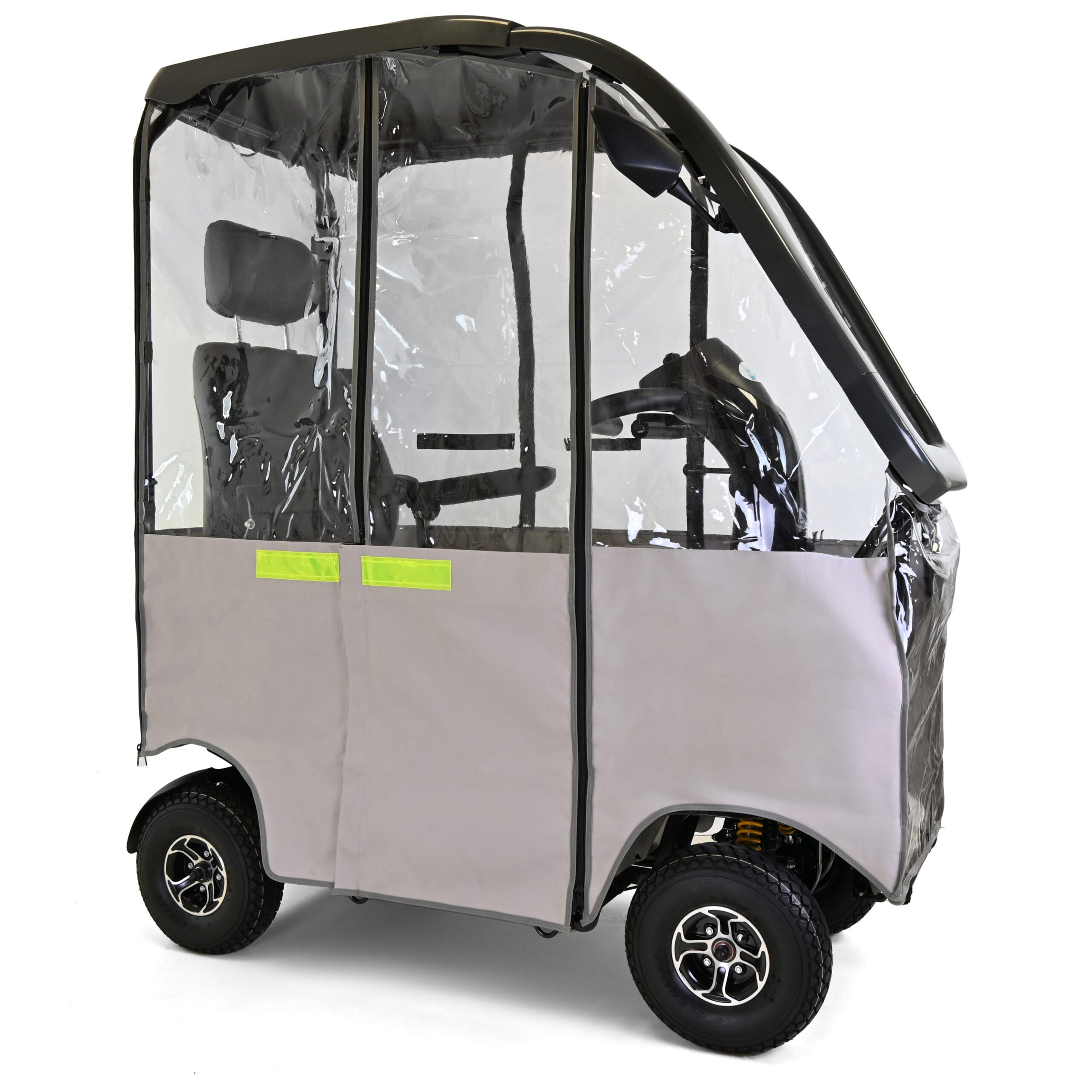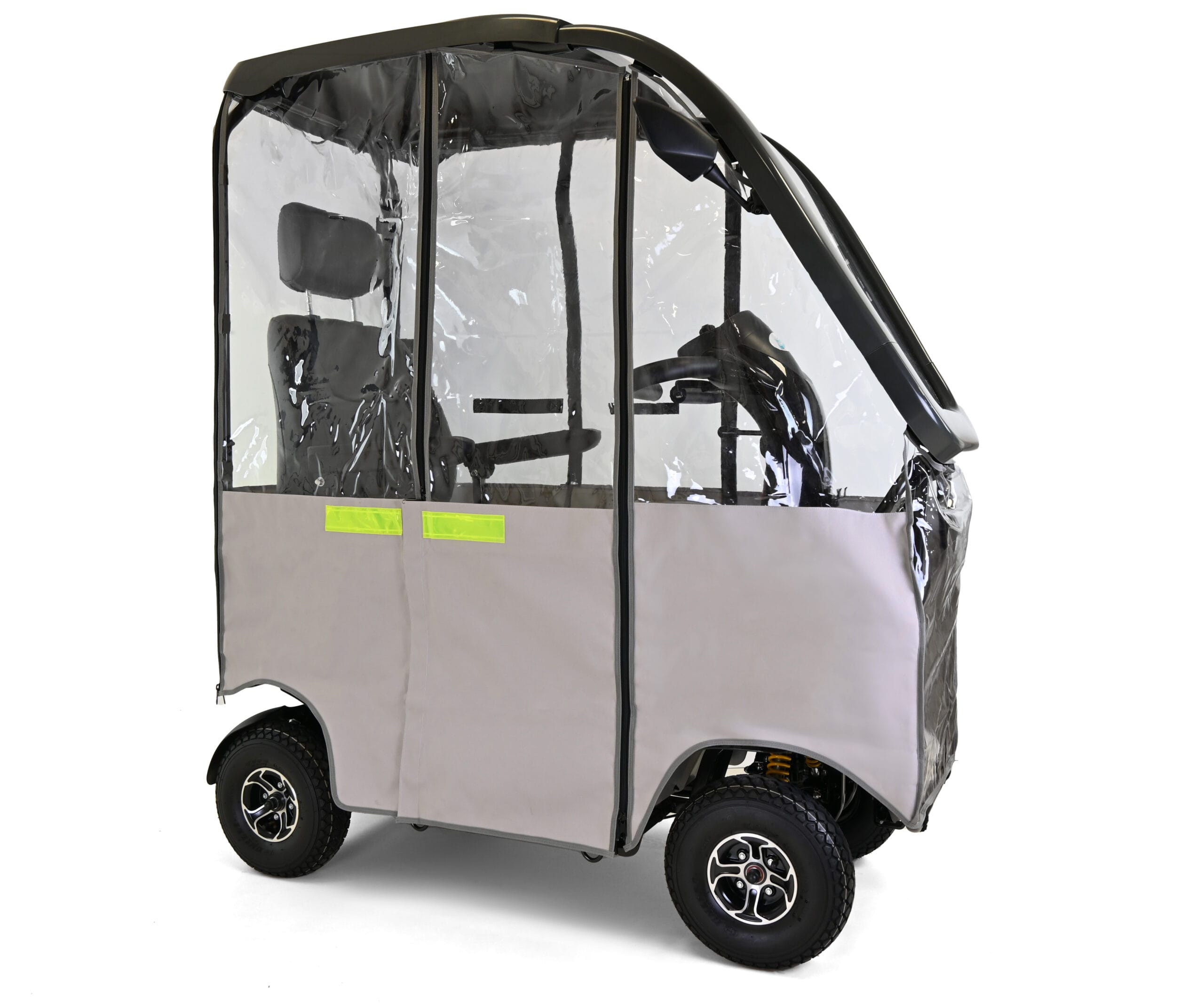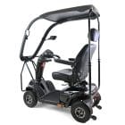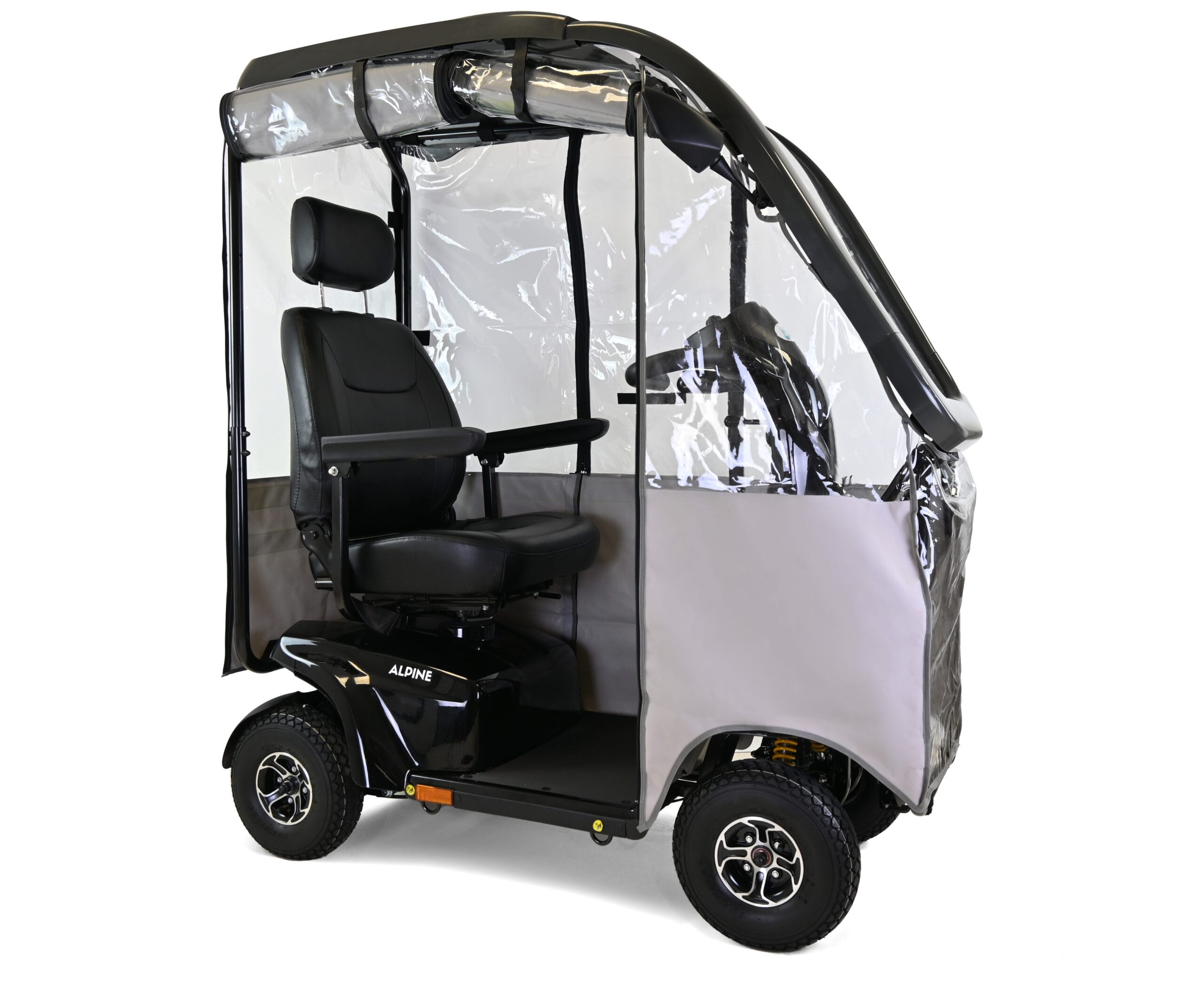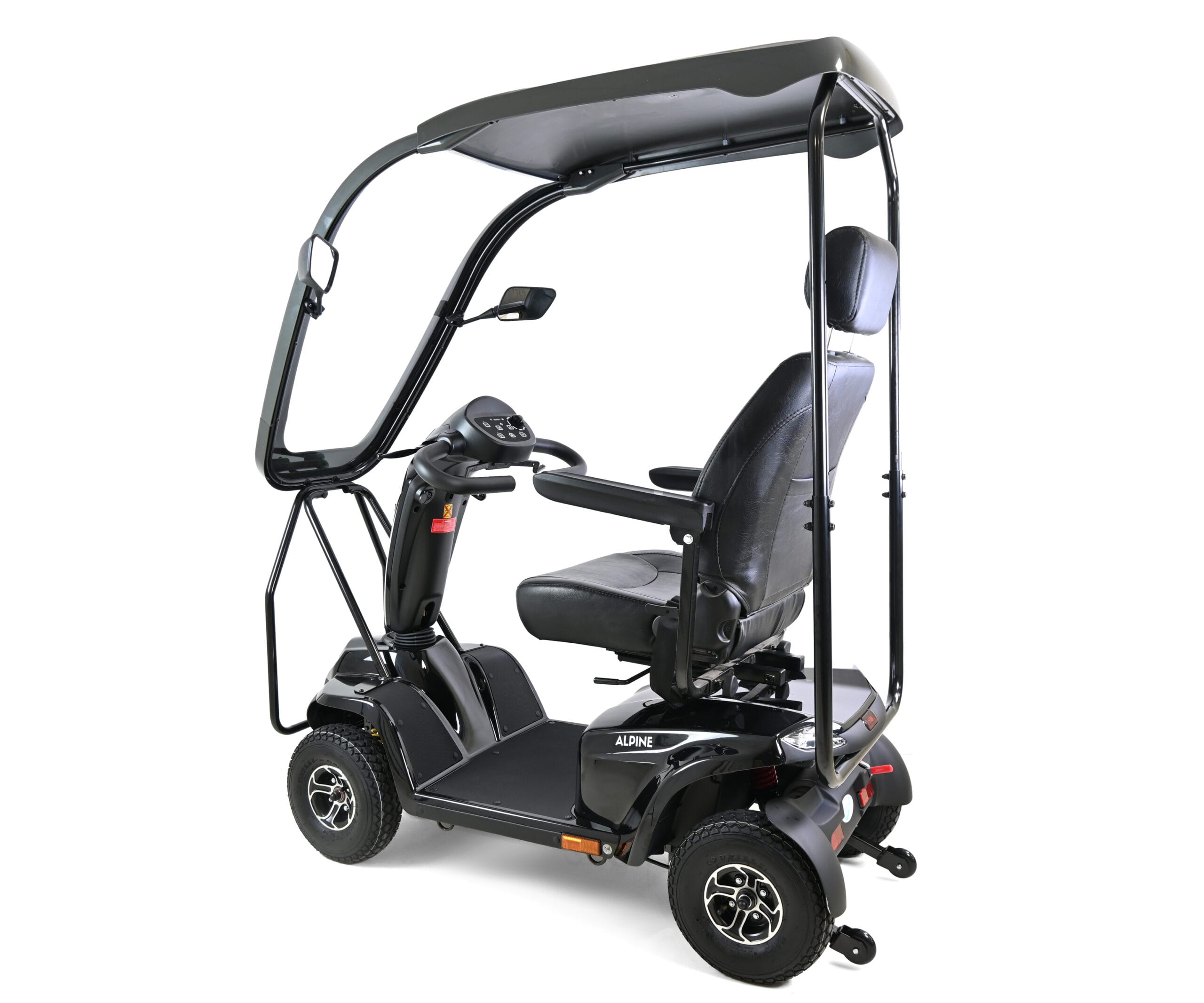The Alpine has been designed and built for luxury travelling with its robust ‘All Weather’ Solid Canopy that allows you to travel in comfort and style come ‘rain or shine’! The large capacity 75Ah batteries ensures complete peace of mind for those long journeys and the powerful motor and drive system makes light-work of steep hills while the unique ‘safety cornering’ system automatically slows the scooter when cornering ensuring not only a very comfortable rider but a safe one to! With the large 13″ tyres and the all-round suspension, the Alpine can clear high ground and travel over rough terrain offering you more flexibility in where you travel. A fully adjustable Captain seat gives a large spacious seating and driving position and ensures exceptional amounts of comfort, perfect for all users. Thanks to the gas-assisted tiller, adjusting the driving controls is simple. With its fully road compliant LED lighting kit, you will feel equally at home in the high street and at shopping centres than you will out in the countryside traversing parkland and beaches. Small in size but enormous in capabilities; the Alpine is the first choice mobility scooter for the users of today.